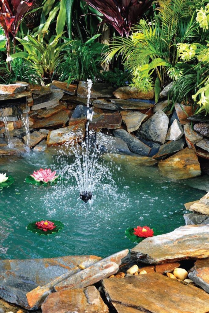 The central spray creates playful water movement, surrounded by layered stone edging and tropical plants.