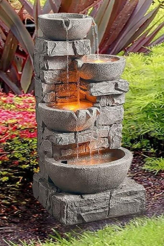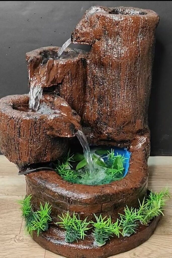 Designed to look like aged tree trunks, its tiered basins create a soothing waterfall effect.