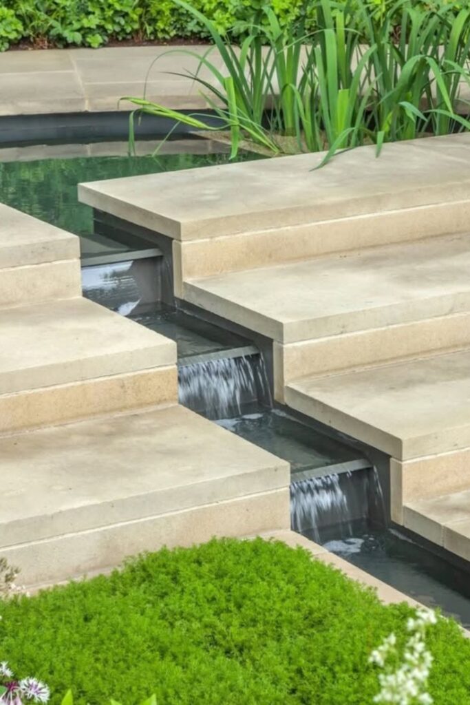 Built from geometric stone slabs, water flows crisply over each step, forming clean mini waterfalls.