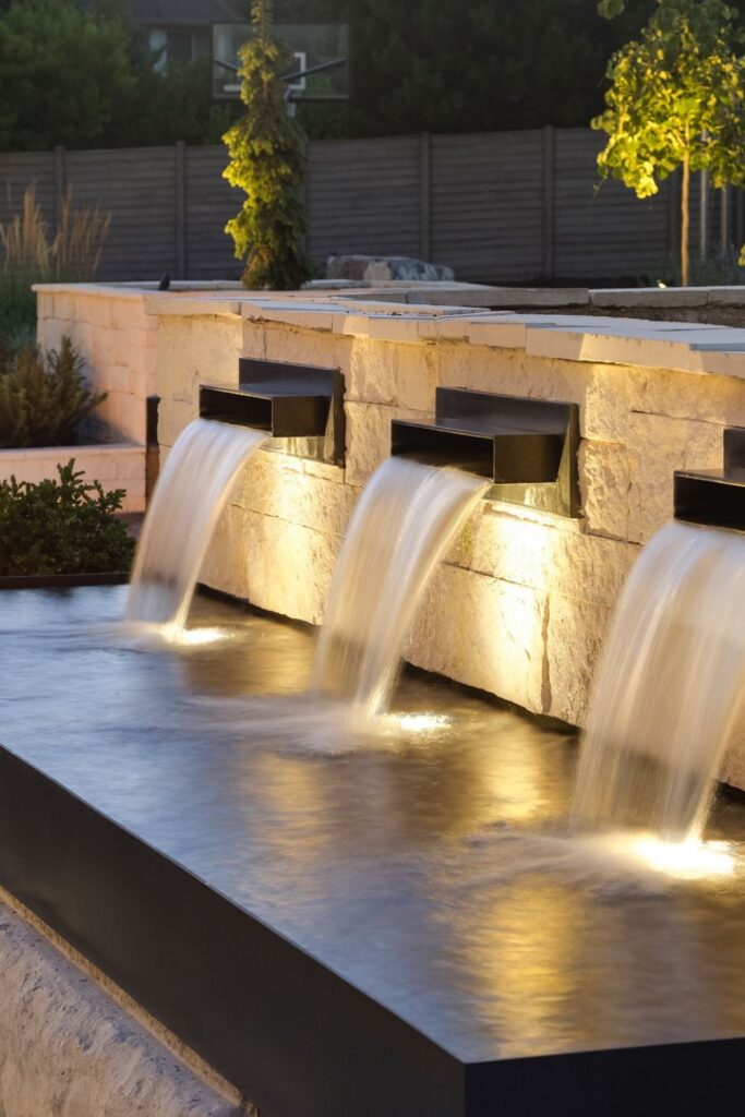 Featuring triple water spouts mounted on a stone wall surrounded by built-in lights, this design creates a dramatic flow into the reflecting pool below.