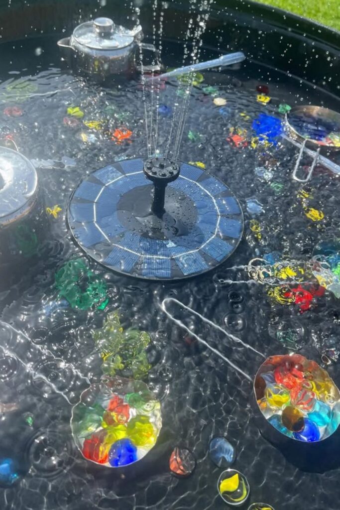 The sun-triggered pump sends water dancing over a shallow basin filled with colorful gems or floating household items.