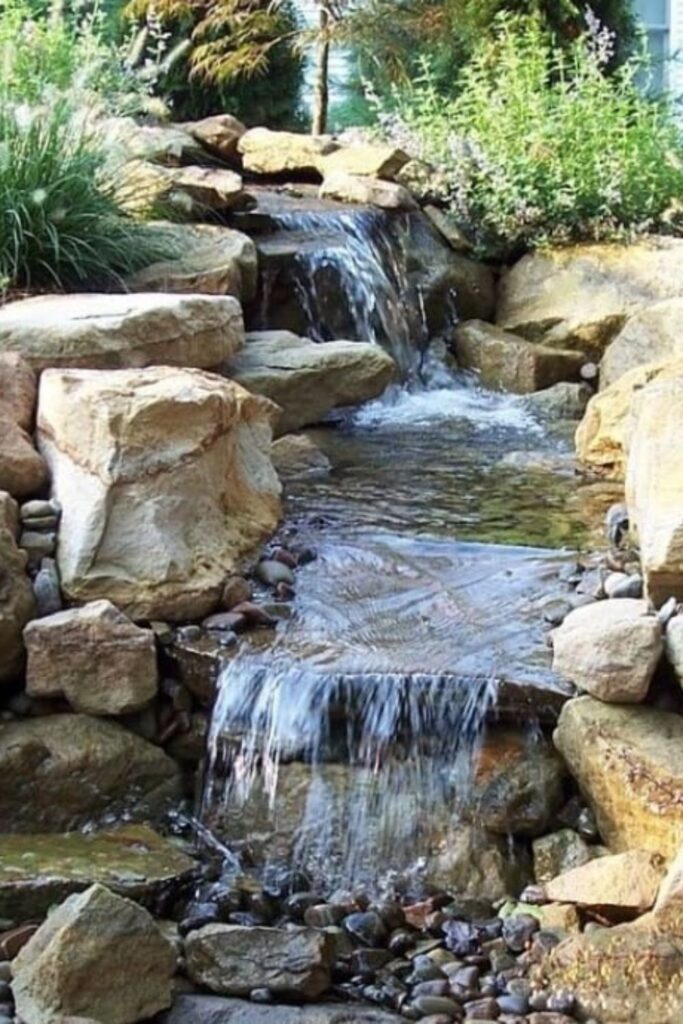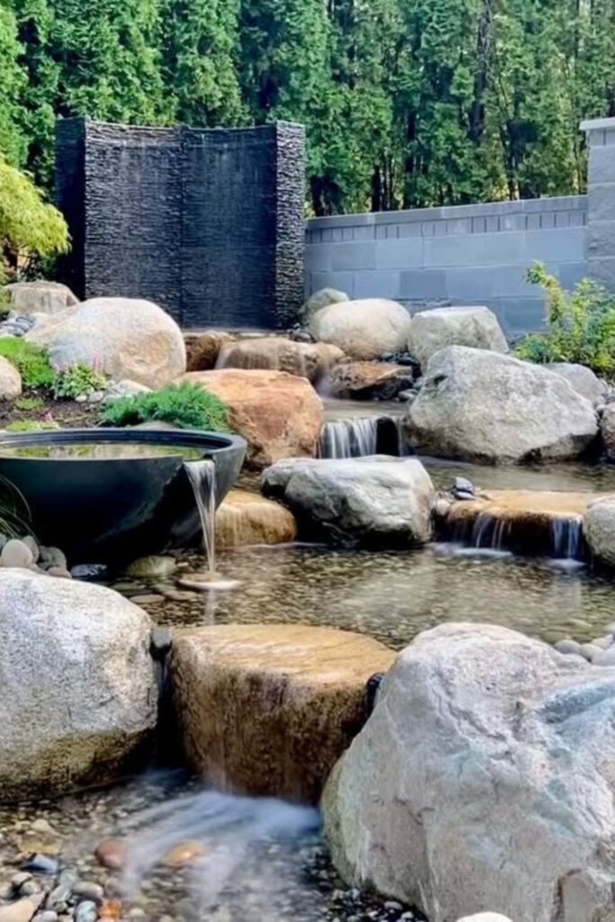 Using large boulders and smooth river stones, water cascades over natural slopes into a shallow basin.