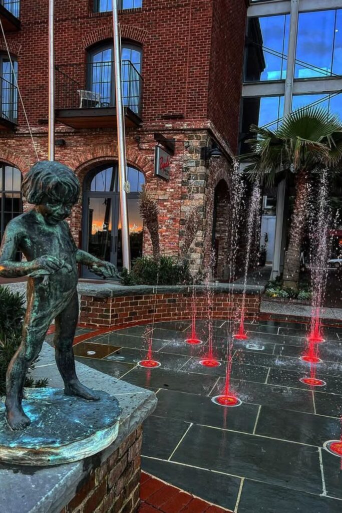 This colorful, interactive feature boasts illuminated jets shooting water directly from the ground, surrounded by brick or stonework.