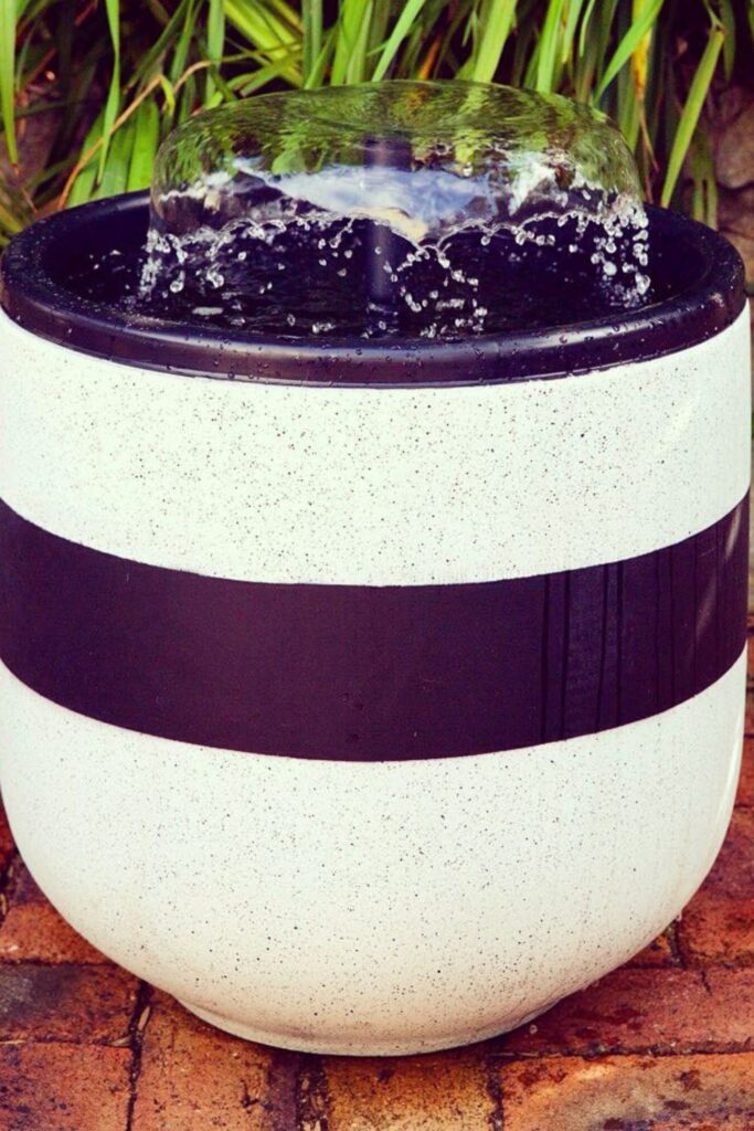 A sleek ceramic pot with clean lines holds a bubbling dome of water that flows evenly across the surface.