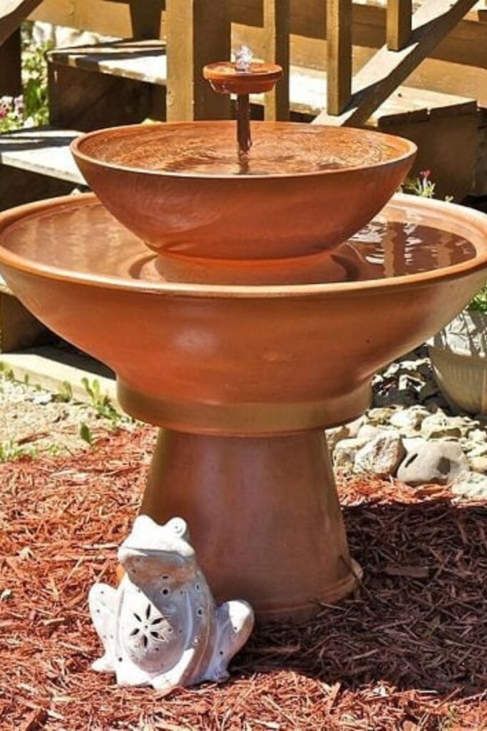 Made from large terracotta bowls, water gently cascades from a smaller top bowl into a wider catch basin below.