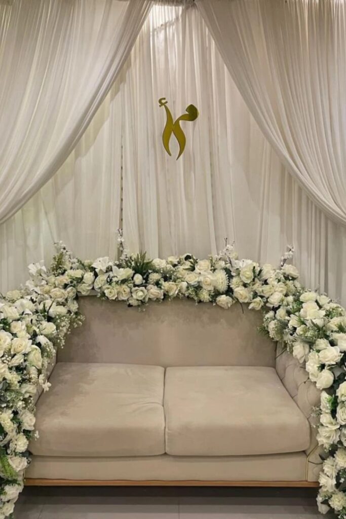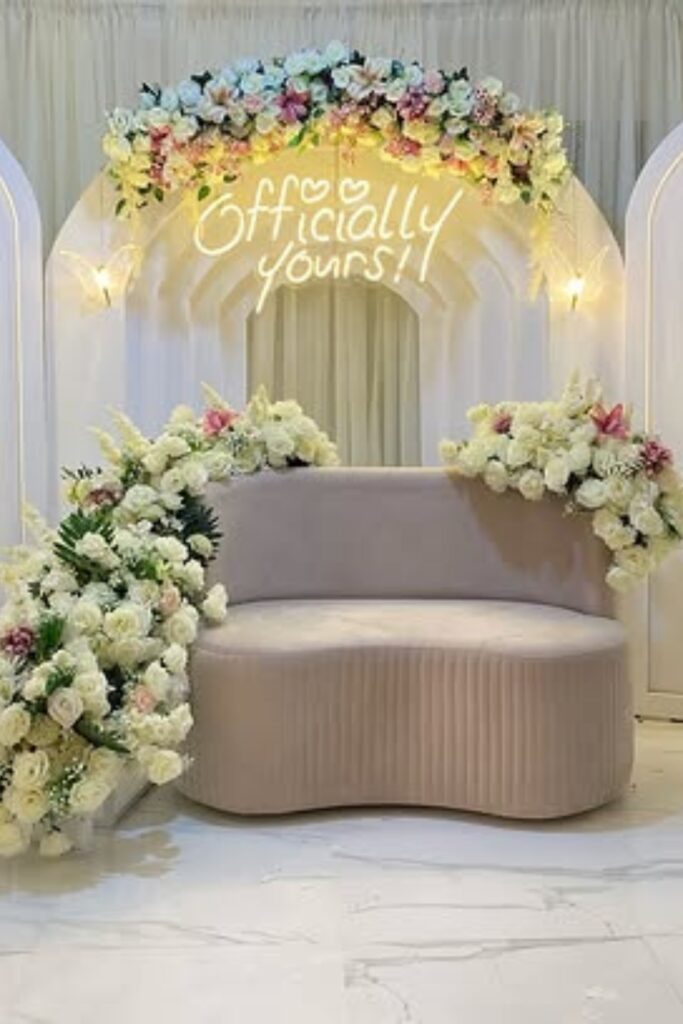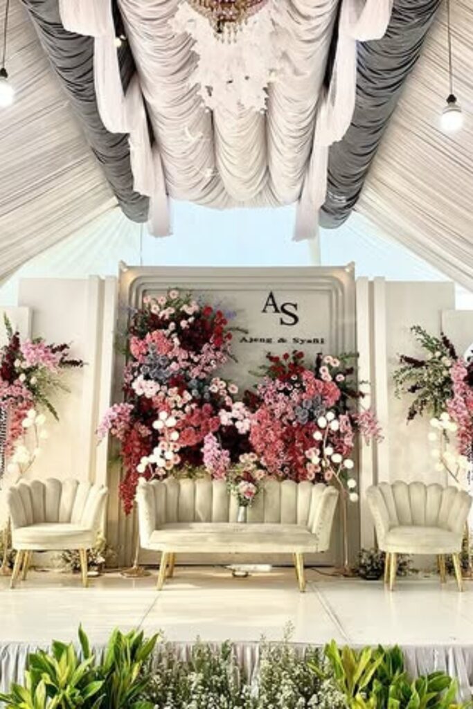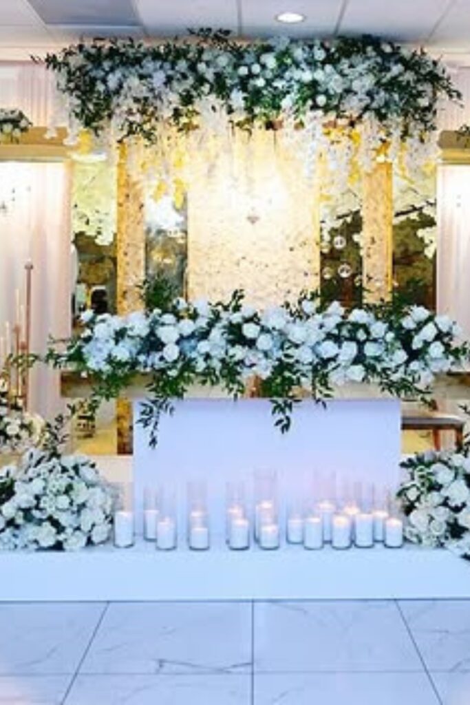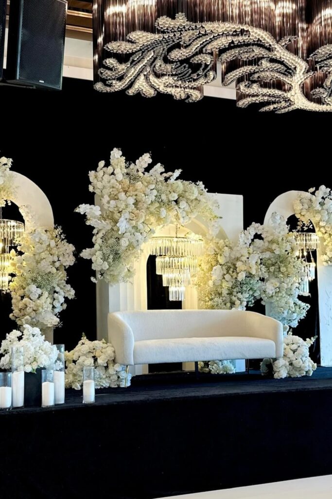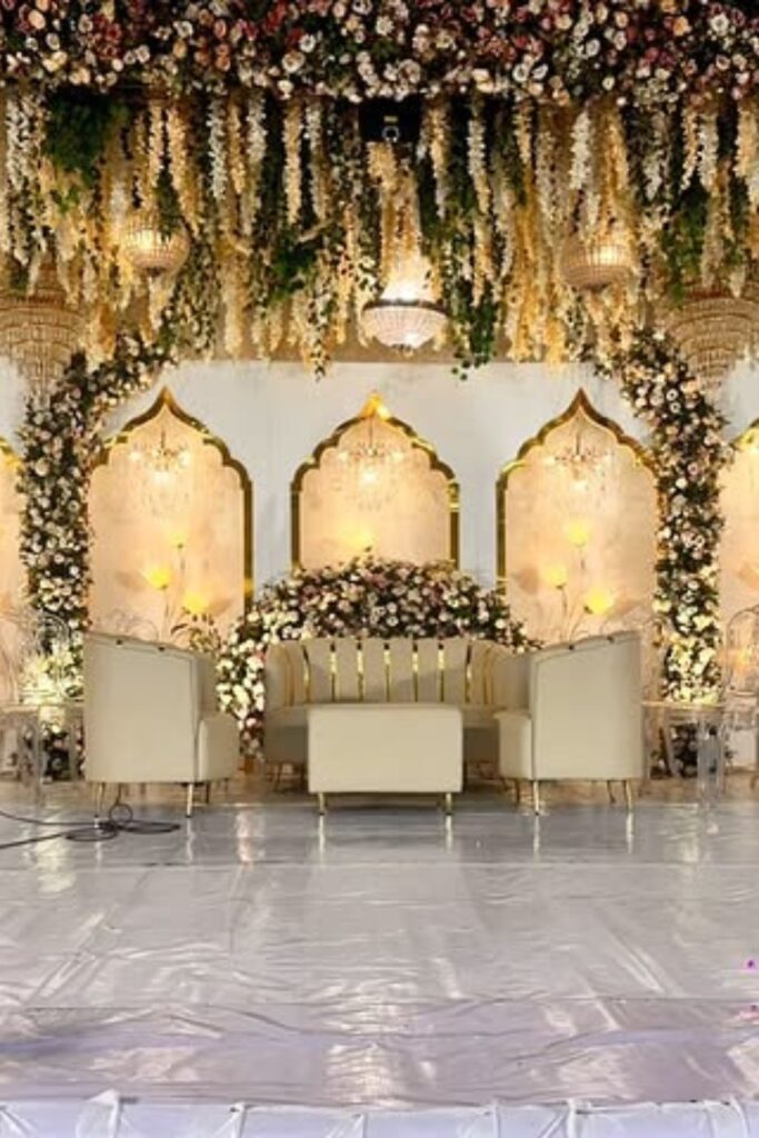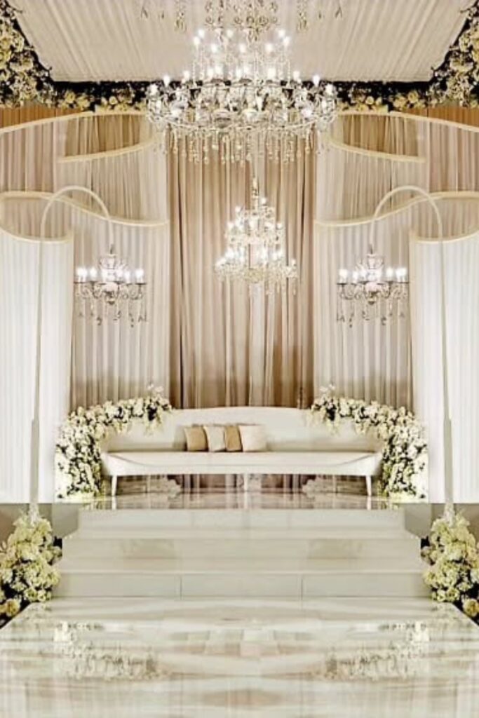 Use hanging chandeliers, floral borders, and layered ivory drapes. Utilize side spotlights and diffused warm lighting from above.