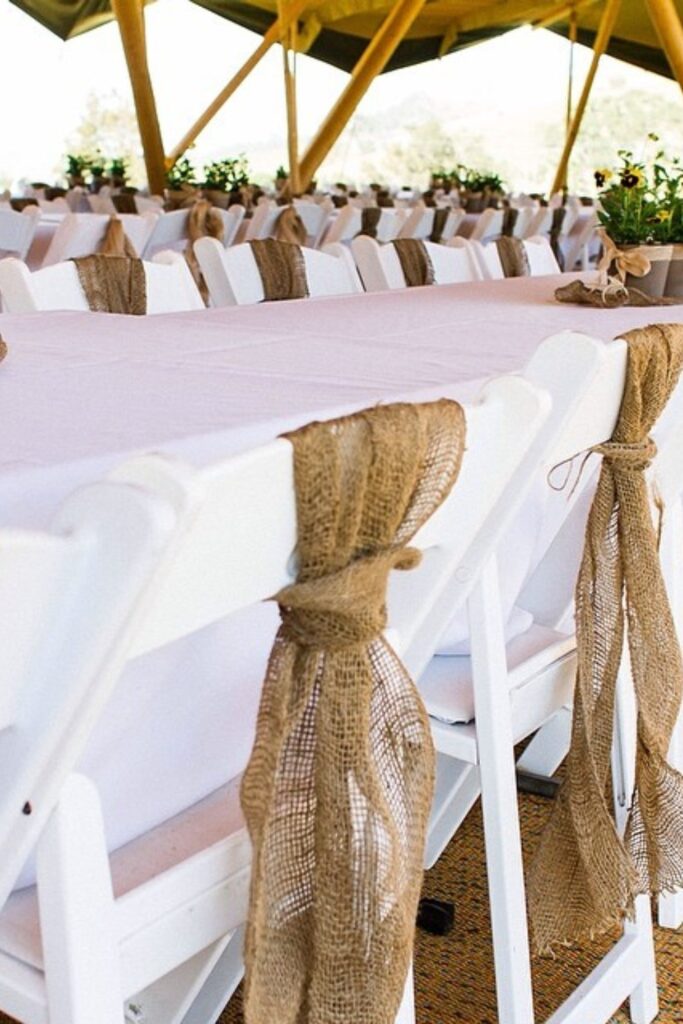 Potted plants lend freshness to the tables, while burlap ribbons tied to white chairs create an earthy, natural atmosphere.