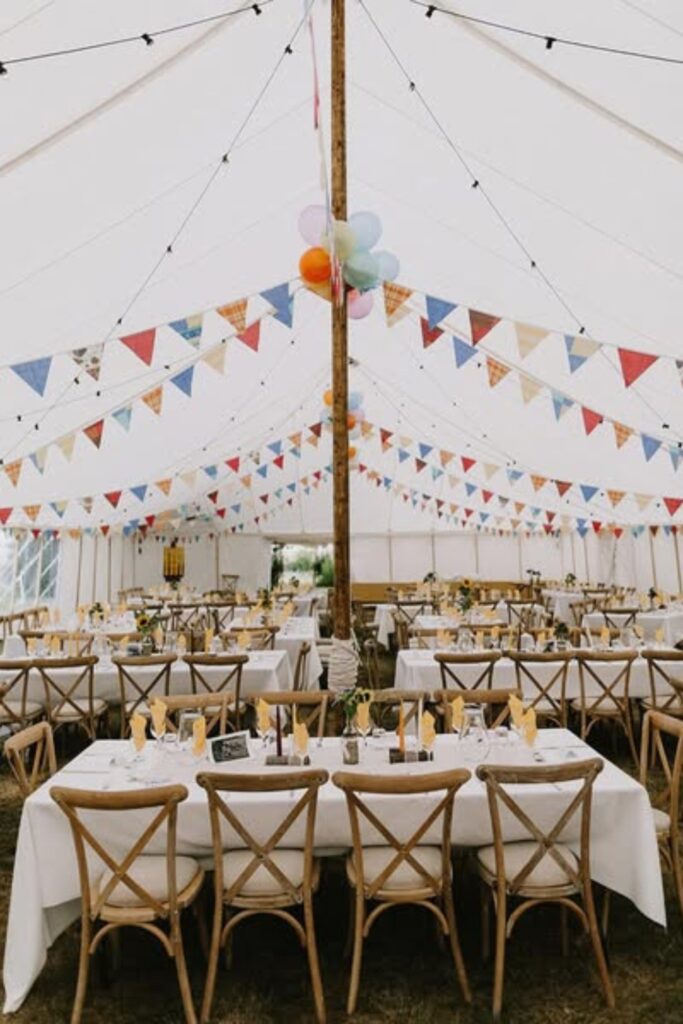 The wooden chairs and white linens maintain balance, simplicity. The vibrant bunting adds charm. Add tiny table centerpieces with vibrant flowers.