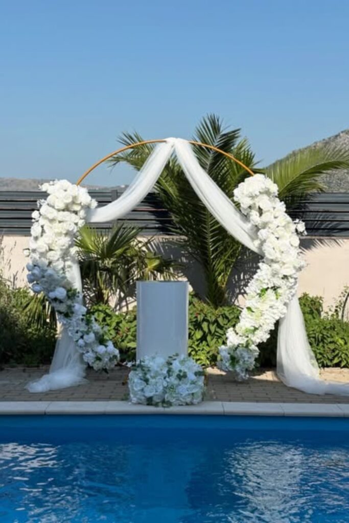 For weddings by the pool or along the shore, this light floral arch is ideal. A bright, romantic appearance.