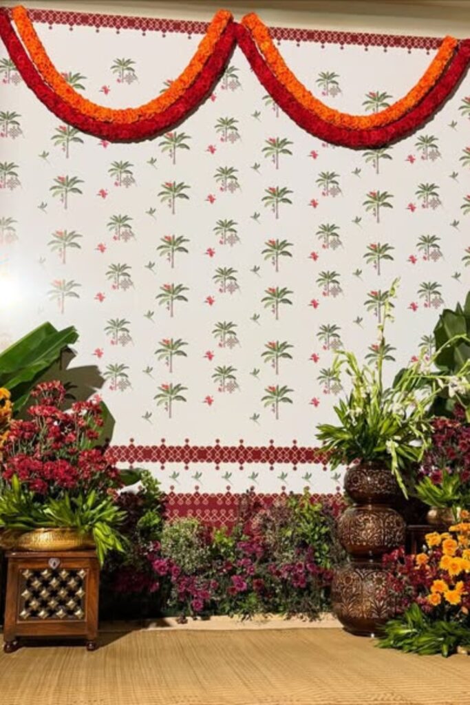 Layered flowers provide depth, and the patterned wall lends ethnic appeal. Use marigold garlands, banana leaves.
