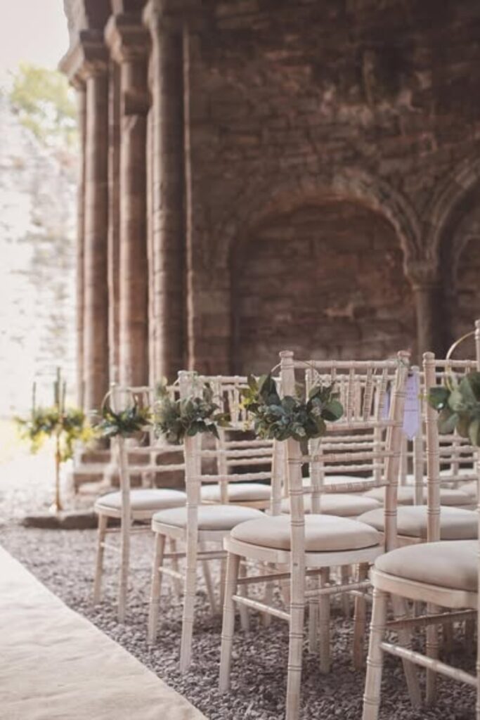 You can replicate this by using soft ribbon to secure olive or eucalyptus branches to each chair.