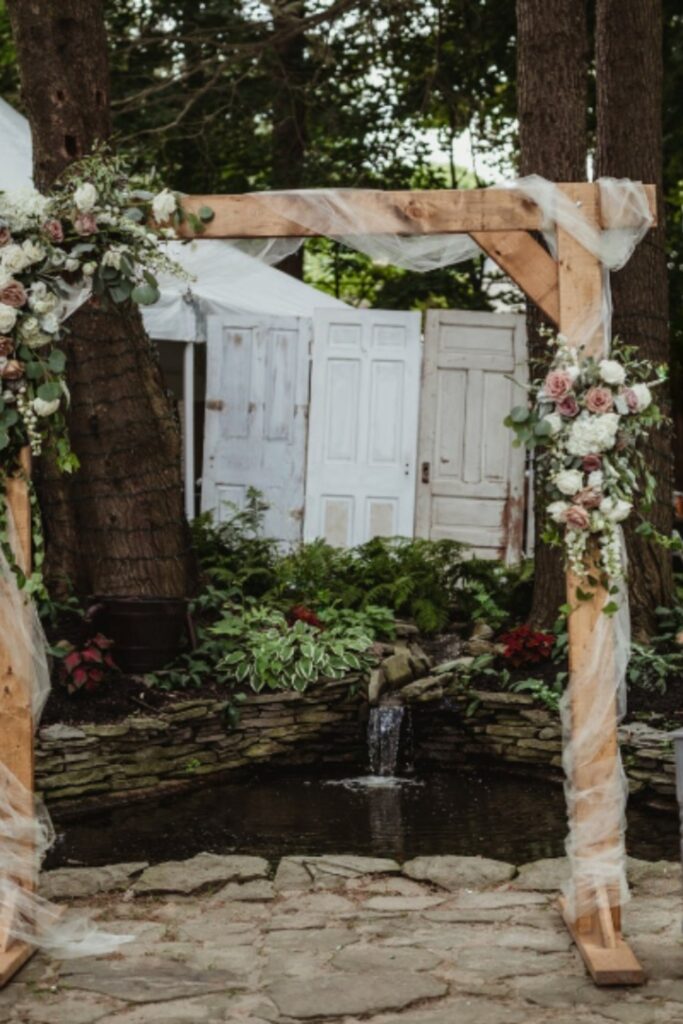 This floral arch along the river is ideal. A lovely frame made of soft ivory and peach blossoms melds with the scenery. Use a metal arch.