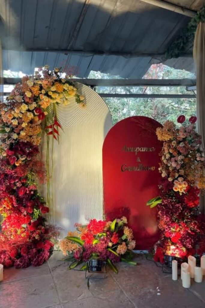 For a romantic interior design, this soft-toned stage blends vibrant red and pink flowers with ivory draperies.