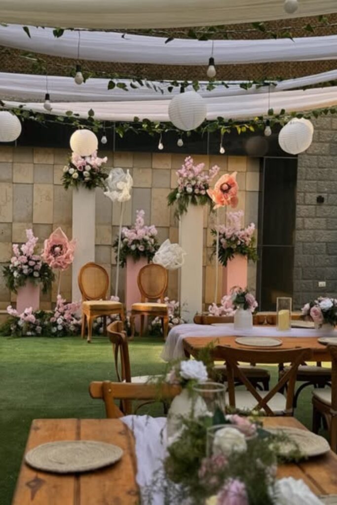 The paper flowers and blush blooms lend a whimsical touch. Use hanging paper lanterns, vertical pillars and wooden chairs.