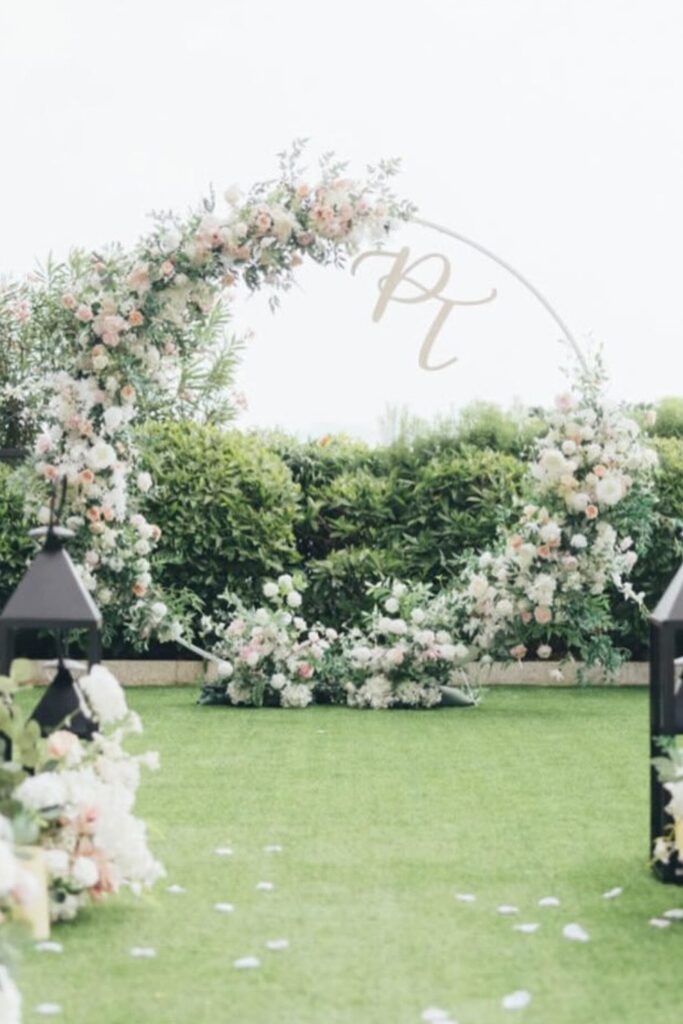 For private garden ceremonies or outdoor vows, this floral circle arch is ideal. Against the backdrop of nature.