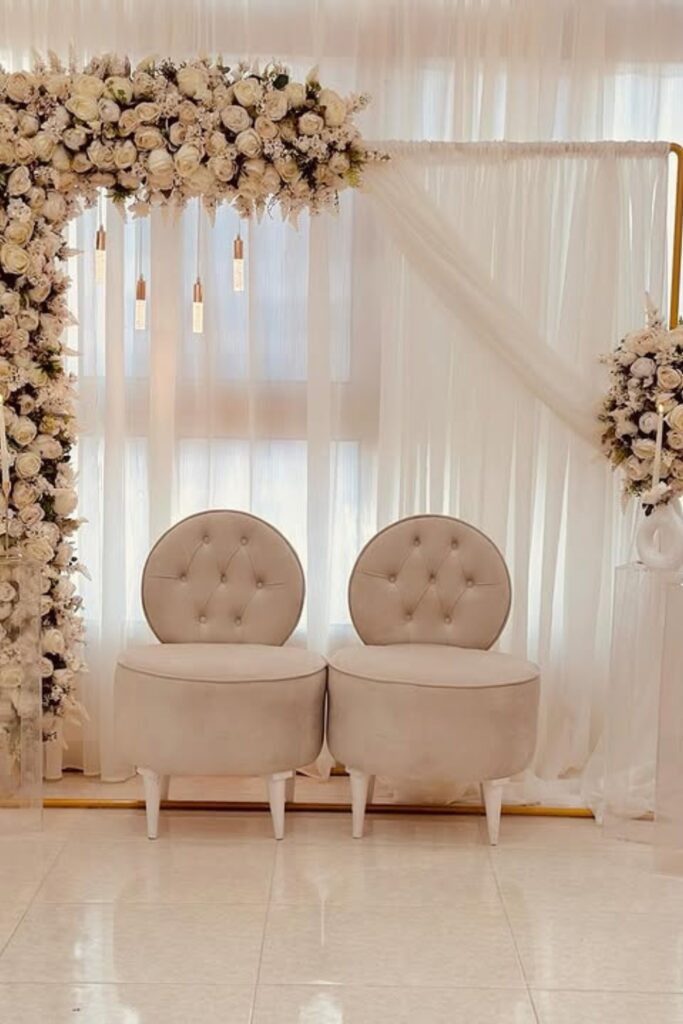 Tufted seats provide elegance, and the floral arch combined with sheer draperies creates a dreamy appearance.