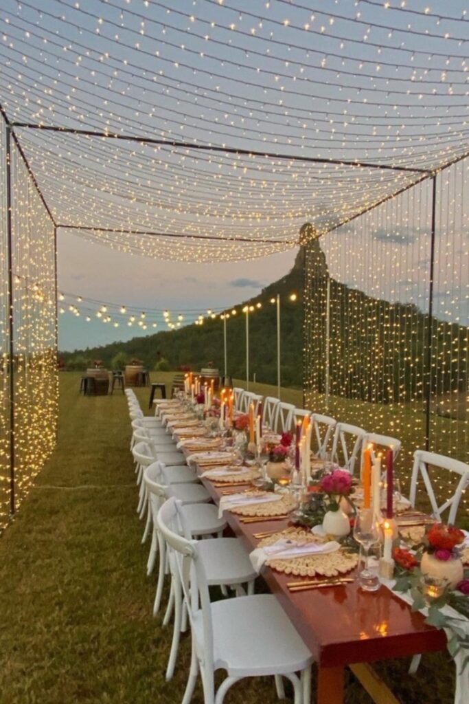Use greenery centerpieces, jute accents, and long white linens. Use candles or mild fairy lights, keeps the rustic appearance warm.