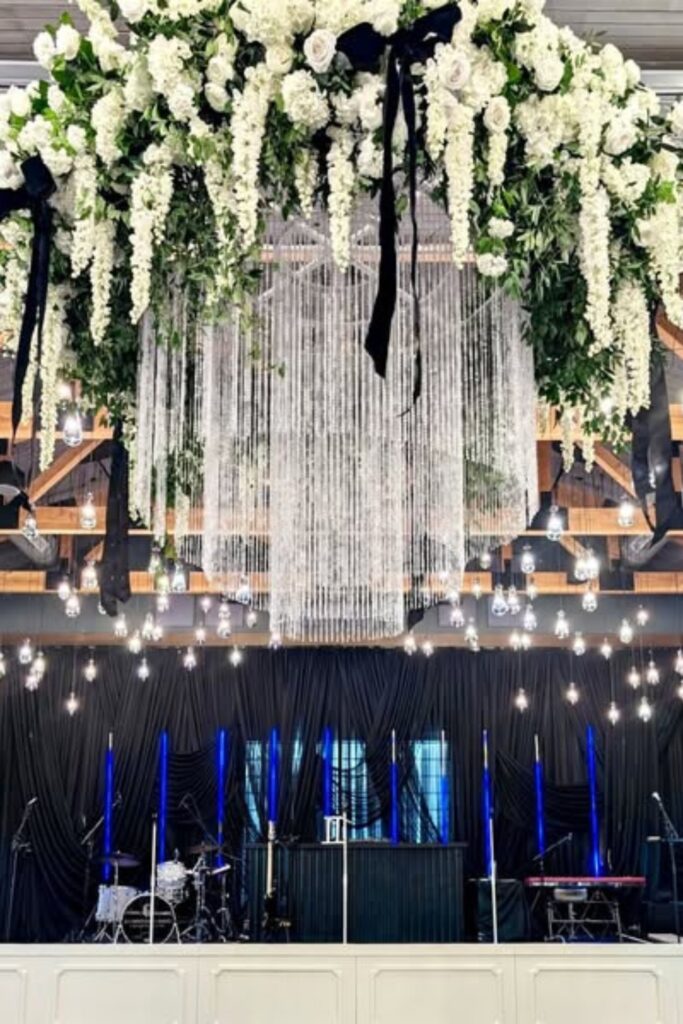 This stage arrangement combines contemporary lighting with classic elegance. By the floral arch and dangling blooms.