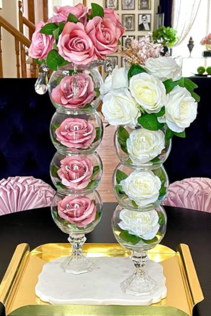 Use glass bowls or vases from the dollar shop, stacked upside down, and firmly fastened. Create a unified look.