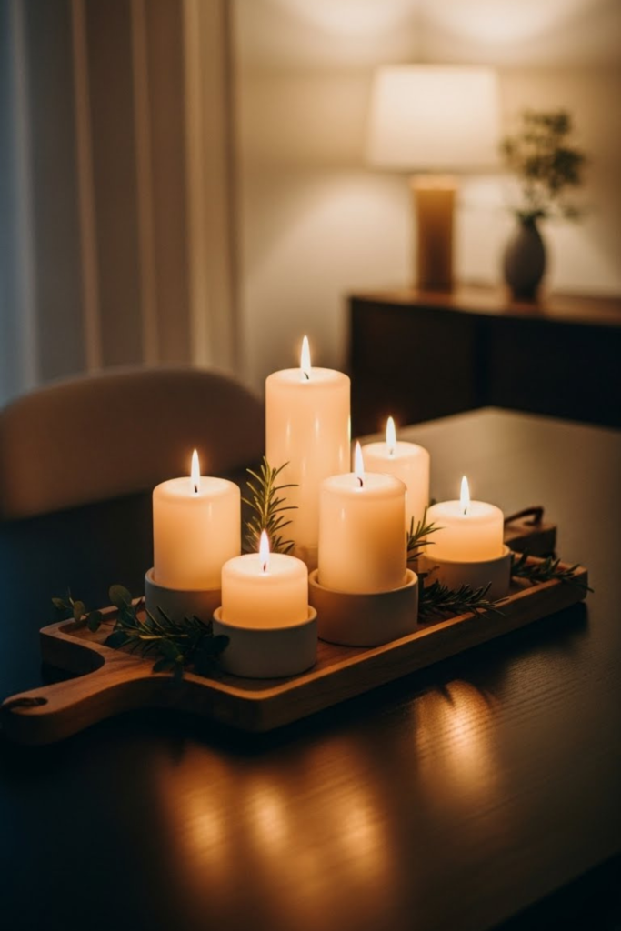 Give the centerpiece a cozy glow, layer candles close by with string or soft overhead lights. Let the lighting do the rest.