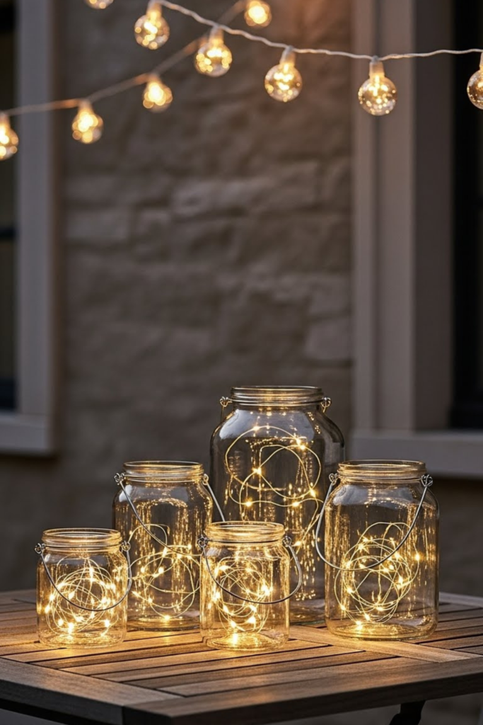 Glass jars from the dollar store can be turned into handles by wrapping wire or rope around them. LED tea lights should be added.
