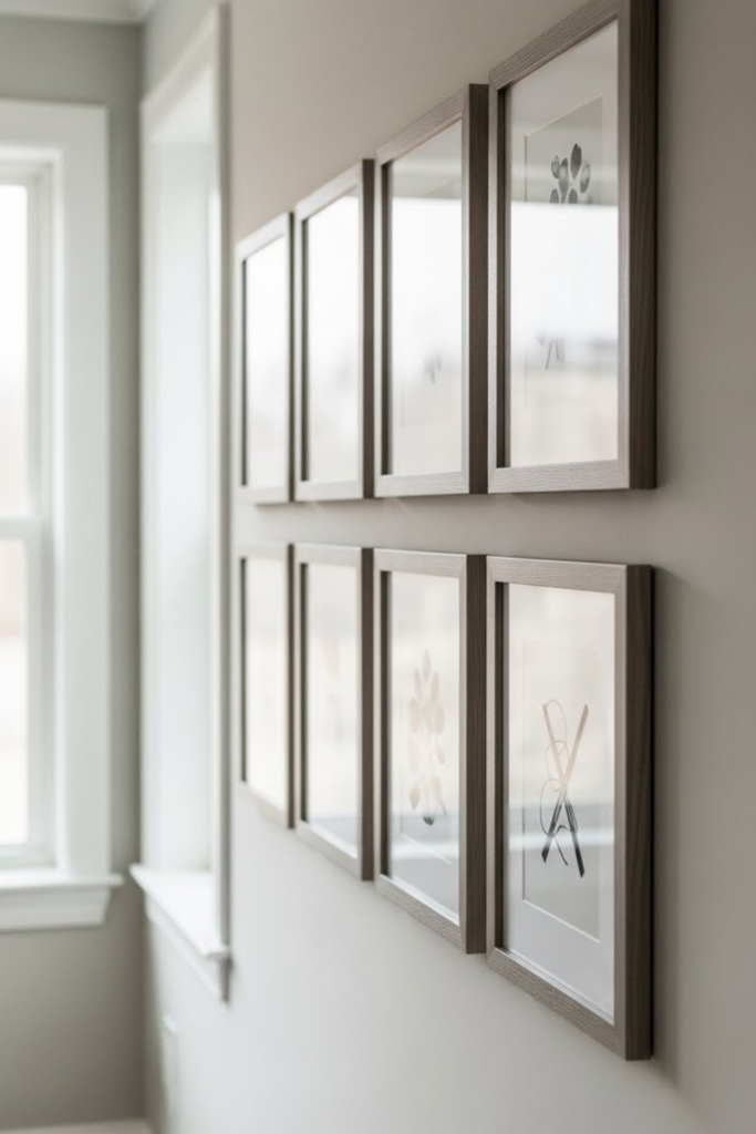 Use dollar store frames and replace the inserts with basic patterns, cloth, or neutral prints, to create a relaxed rather than rigid pattern.