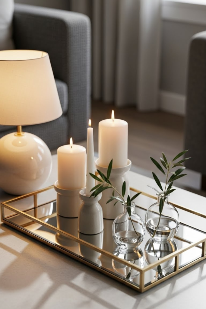 Tray décor, candle holders, wall art, imitation plant arrangements, seasonal centerpieces, and straightforward storage solutions are examples of items.