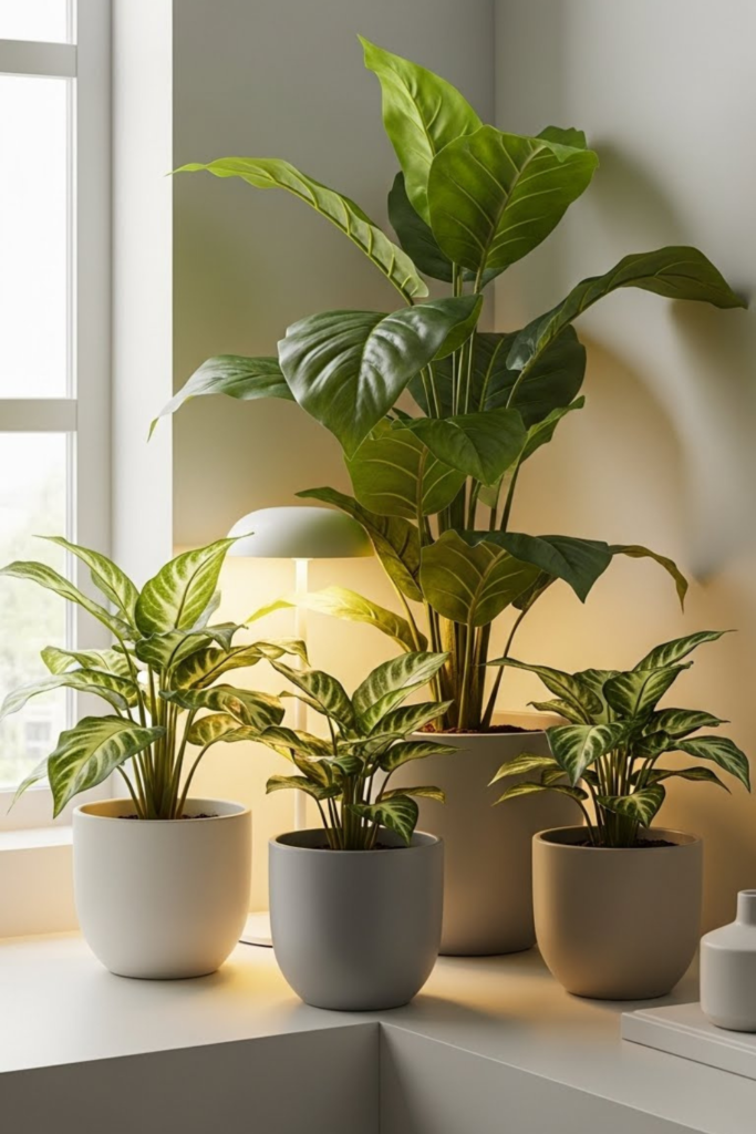 Keep the pots simple. The foliage appears more lifelike when the colors are neutral. Use soft lamps at night.