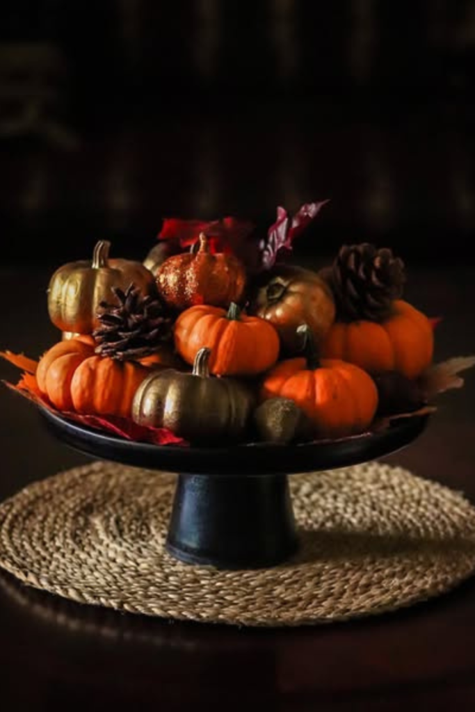 Fill a dollar shop bowl or cake stand with fake miniature pinecones and pumpkins, stick to two or three tones.