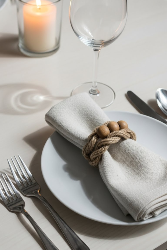 Candlelight is ideal, as it draws attention to the details and gives even basic napkin rings a sense of thoughtfulness and preparation.
