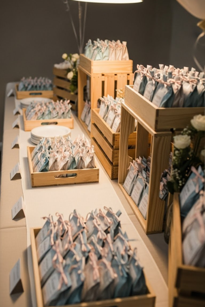 Party favors can be neatly arranged and sized using dollar store containers, trays, or risers, works well.