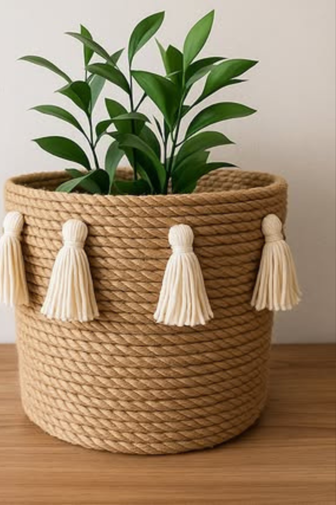 Start by using hot glue to securely wrap a dollar store plastic basket with rope. Add a genuine or fake plant. [Check similar on Amazon]