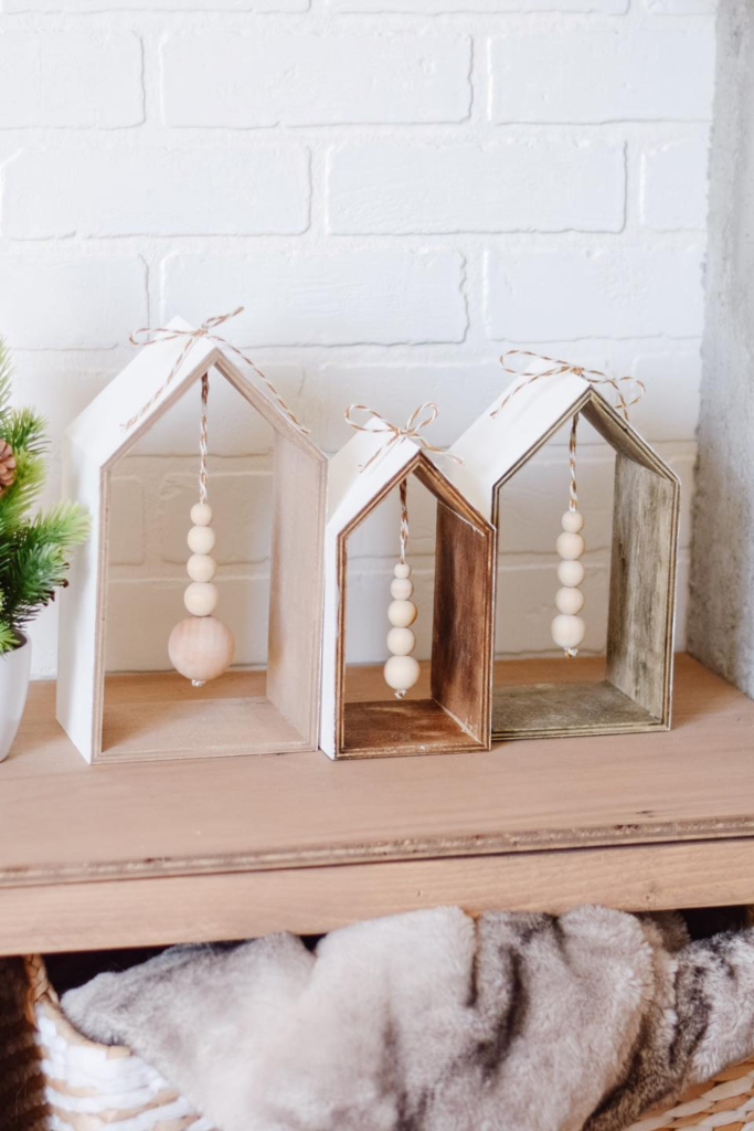 You want understated décor. Paint dollar store wooden houses in warm wood tones or gentle neutrals. Add basic beaded garlands inside.