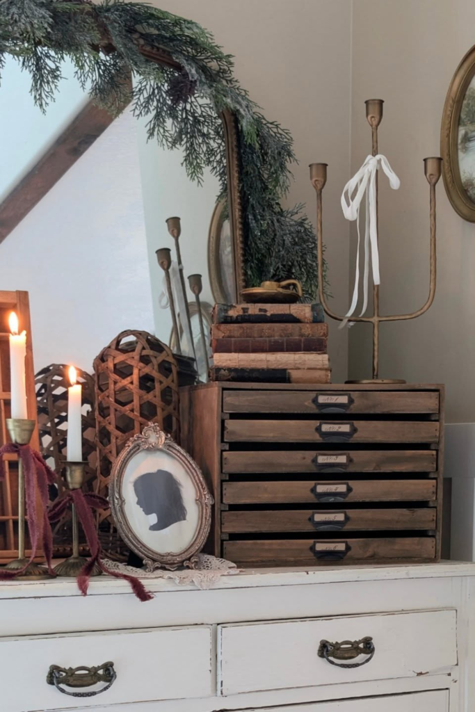 Use small storage boxes, candle holders, dollar store frames, and artificial vegetation. Rather than dispersing objects, stack them.