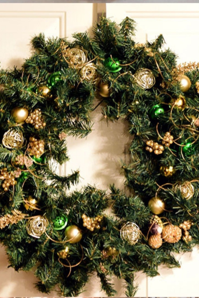 Make it feel full rather than busy, start with a dollar store wreath base and add ornaments in two or three different colors.