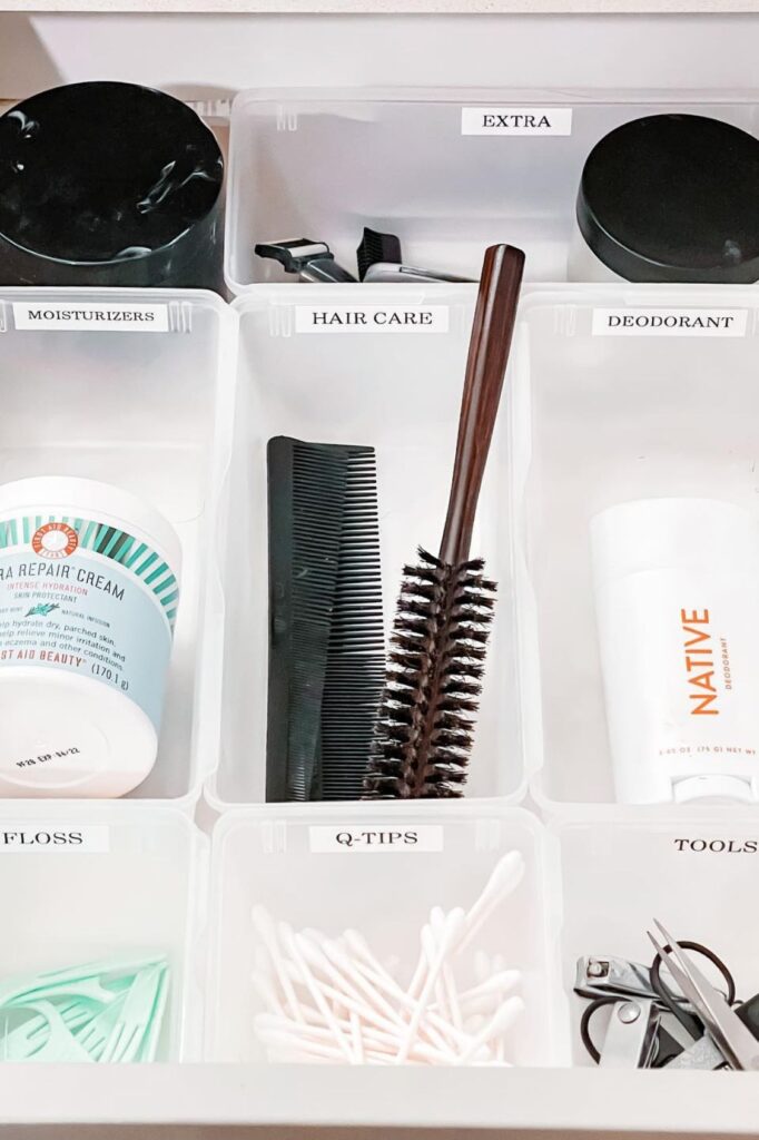 Deodorant in another, skincare in its own bin, and little items like floss or cotton swabs should go in small containers.