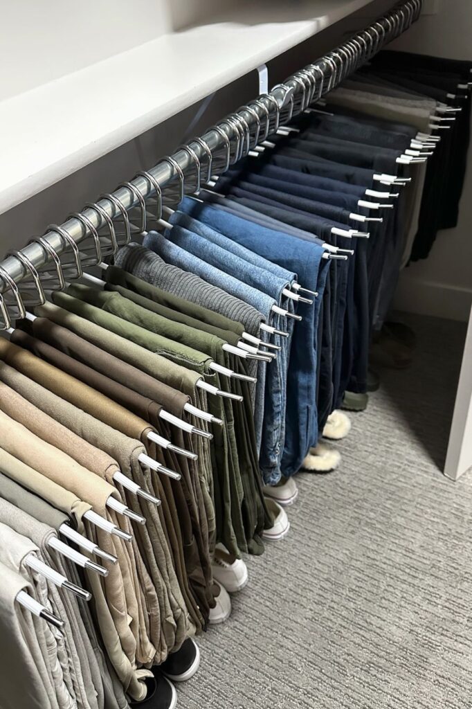Put each pair of pants on a bar, and the closet will seem cleaner right away. It also makes it easier to choose an outfit because you can see all the colors and styles at once.
