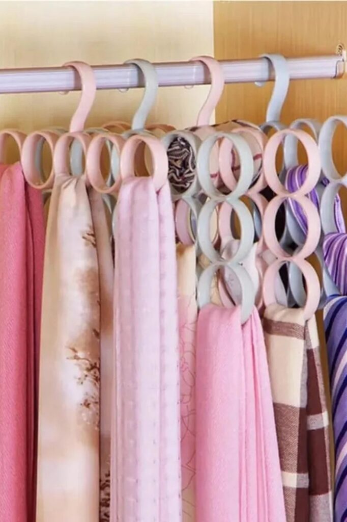 Closet rods become far more useful once scarves stop piling into drawers. A ring-style hanger keeps every scarf hanging separately so fabrics stay wrinkle-free and easy to see.