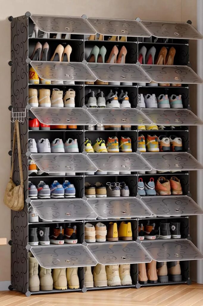 Adding clear lids or front covers keeps dust out while still letting you see what’s within. When shoes have their own wall, the space looks cleaner right away and stays organized.