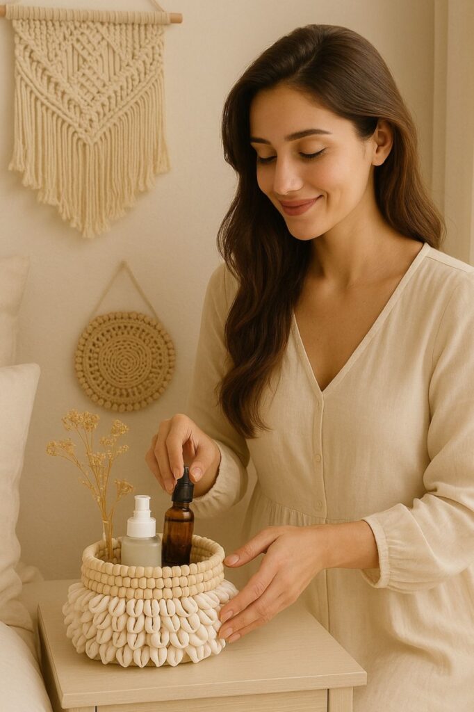 This design is best for calm bedroom corners or bedside tables because it puts your daily skincare close at hand before bed.