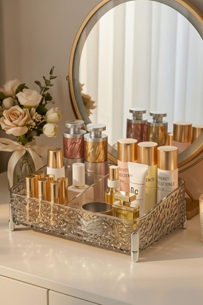 Skincare bottles and perfumes often scatter across a dresser once the collection grows. A simple tray instantly gathers everything into one organized spot.