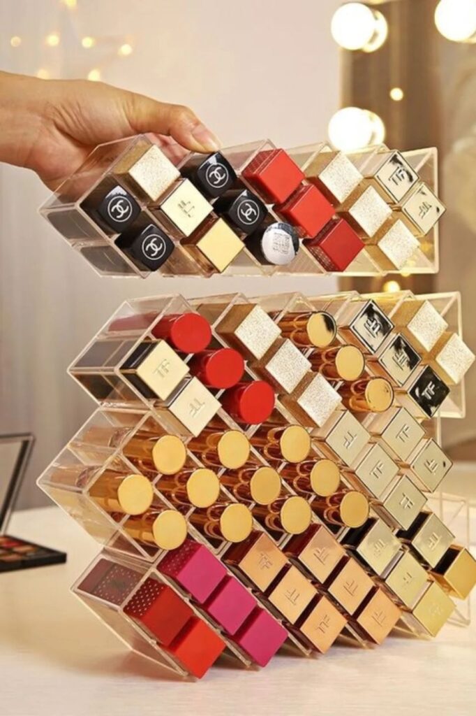Lipsticks usually disappear inside makeup bags where shades get mixed together. A clear grid organizer solves that instantly by giving every lipstick its own slot.