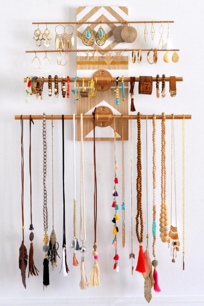 Bracelets and earrings sit neatly across the upper bars, and long necklaces hang from the lower rods.