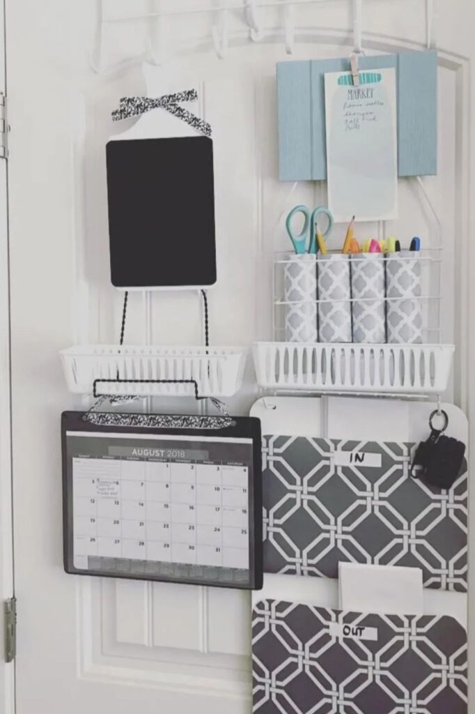 May turn the back of a bedroom door into a place to keep everything organized. Small containers keep pens, scissors, sticky notes, and other ordinary items upright.