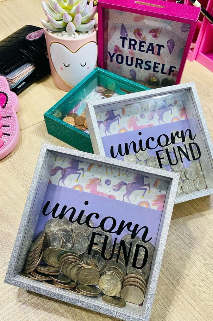 Put colorful paper or printed designs inside the frame, then add a small label with a fun name like “Savings,” “Travel Fund,” or something else.