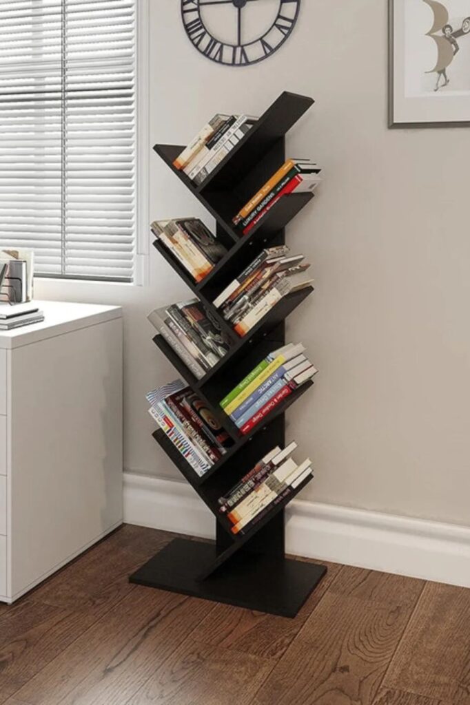 Corners often stay empty even though they could hold a surprising amount of storage. A tree-style bookshelf.