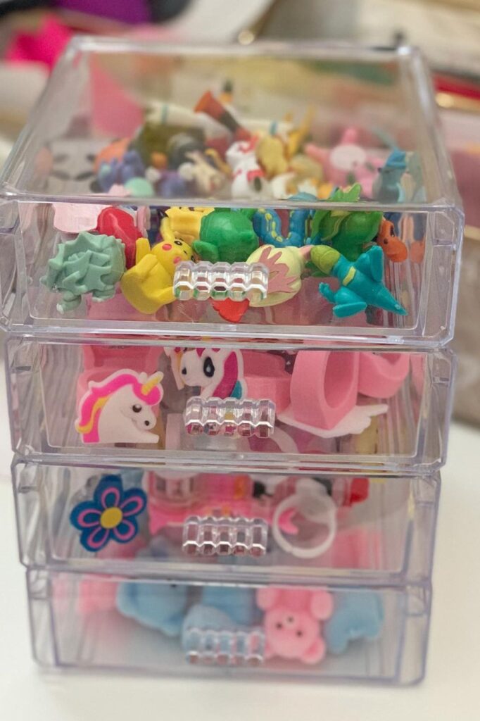 Tiny items create the most clutter because they rarely have a proper place to live. A stack of small clear drawers.