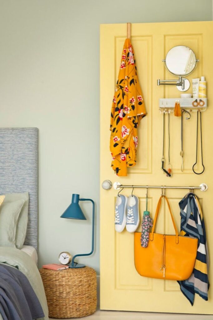 Bedroom doors often stay unused even though they can hold a surprising amount of storage. A simple tension rod or hanging bar across the door.