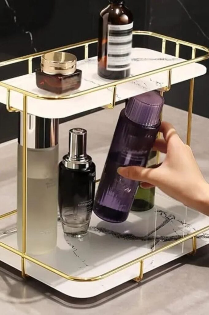 Counter space disappears quickly once skincare bottles start piling up. A simple two-tier rack instantly doubles the usable space by stacking products vertically.