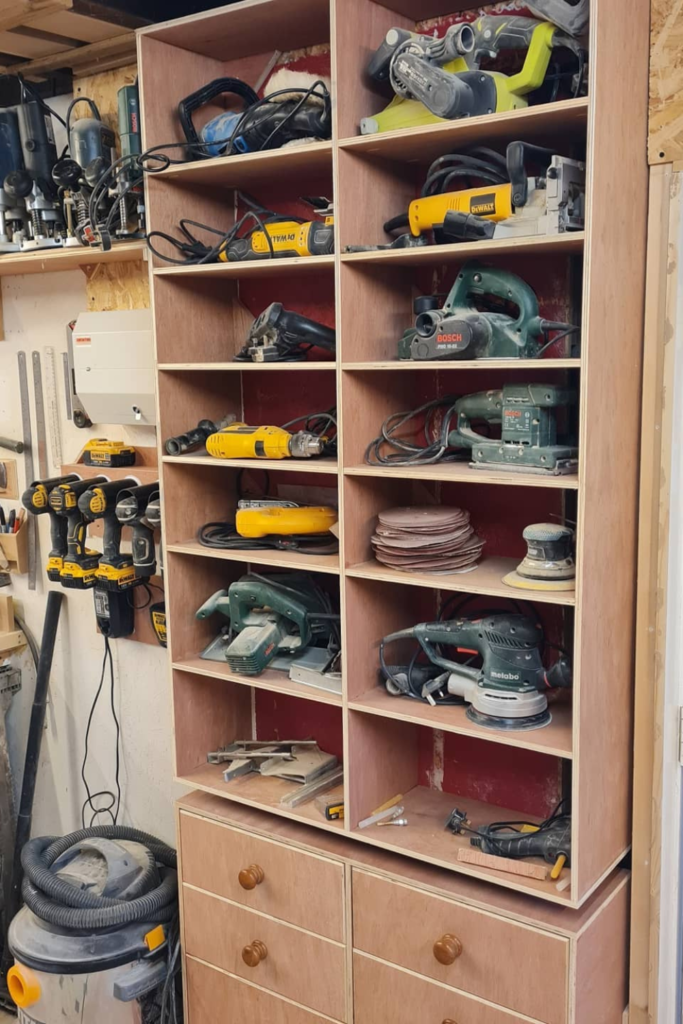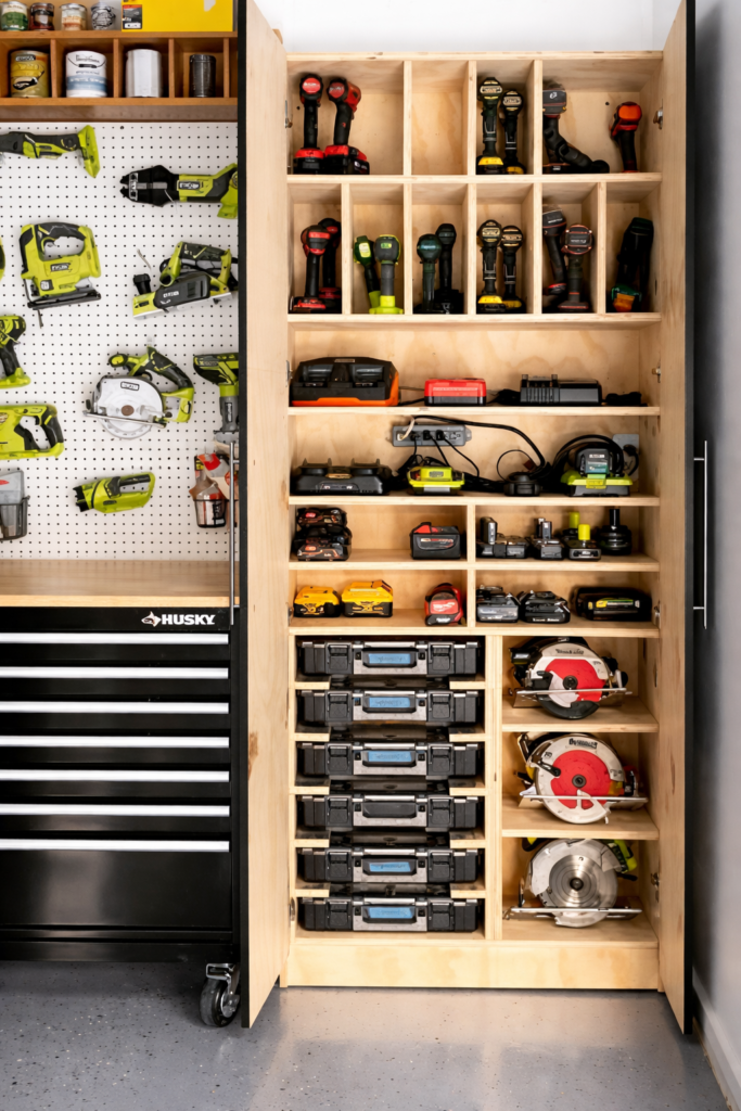 Wall space isn’t just for hanging tools. A tall cubby cabinet like this gives every drill and power tool its own slot.